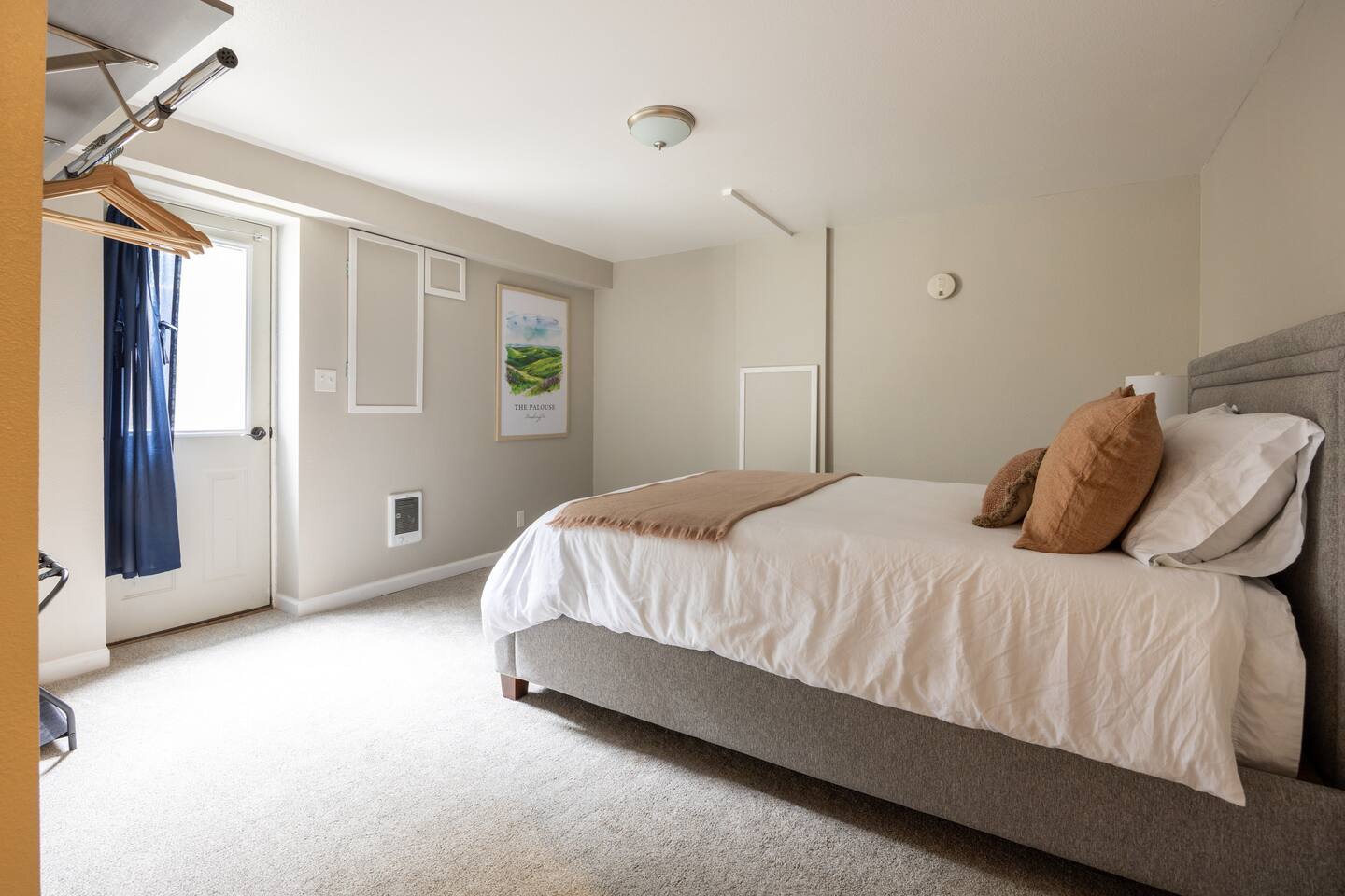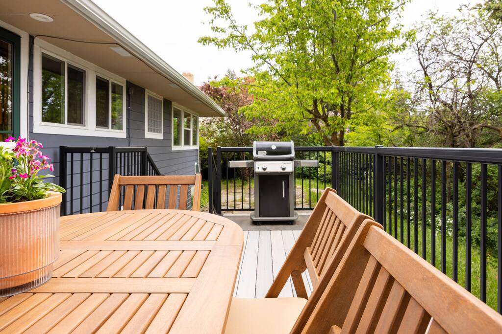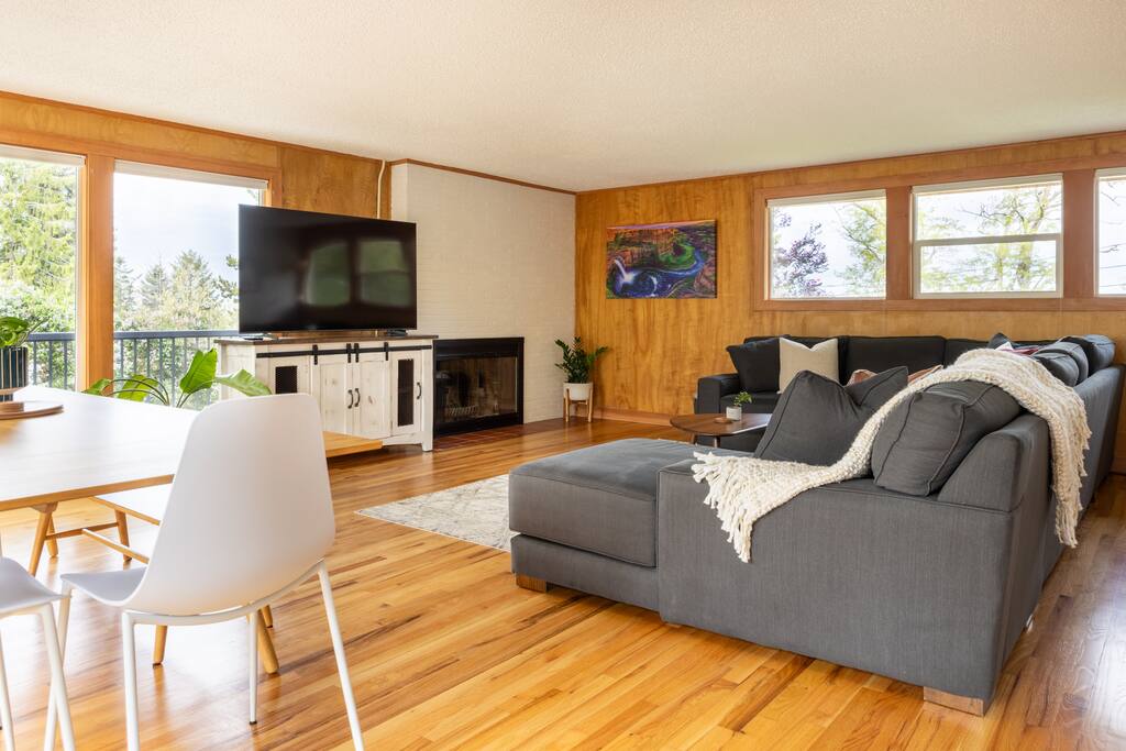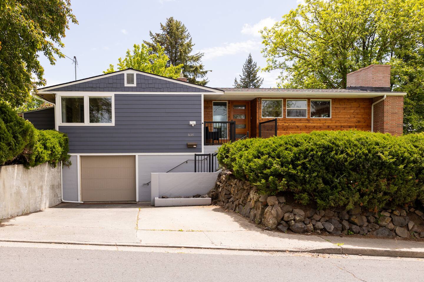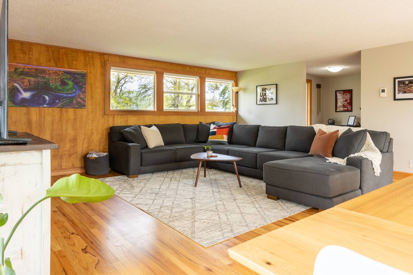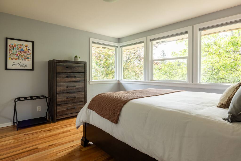 Welcome to The Stadium View House – your home away from home! This spacious and stylish five-bedroom, two-bathroom home is located just steps from Washington State University, offering unbeatable views of campus and the rolling hills of the Palouse. Whether you’re here for a game, graduation, or a quiet getaway, you’ll enjoy comfort, convenience, and character in this updated mid-century retreat. Step inside the upper level and you’re greeted by a bright, open-concept living and dining area with expansive picture windows that frame the stadium and university skyline through the trees. The living room is perfect for gathering, relaxing, or streaming your favorite shows with fast WiFi. Adjacent to the dining space, a large back deck awaits—with a gas grill and plenty of seating—ideal for outdoor meals or evening hangouts. The fully stocked kitchen includes everything you need to cook at home, from cookware and utensils to a Keurig with coffee pods and tea. Upstairs you’ll also find two cozy bedrooms with queen beds, luxe linens, and convenient storage, as well as a full bathroom with a tub-shower combo. Head downstairs to discover three more bedrooms, each with a comfortable queen bed. Two are spacious and airy, while the third is snug yet restful—perfect for a good night’s sleep. All rooms offer closet space or luggage stands for your convenience. The lower level also features a second bathroom, laundry room with washer/dryer, and a fun retro-style drinks fridge. Original mid-century wood paneling adds a nostalgic charm throughout the downstairs level. Perfect for: Couples, families, alumni gatherings, game day weekends, graduation celebrations, and extended stays.