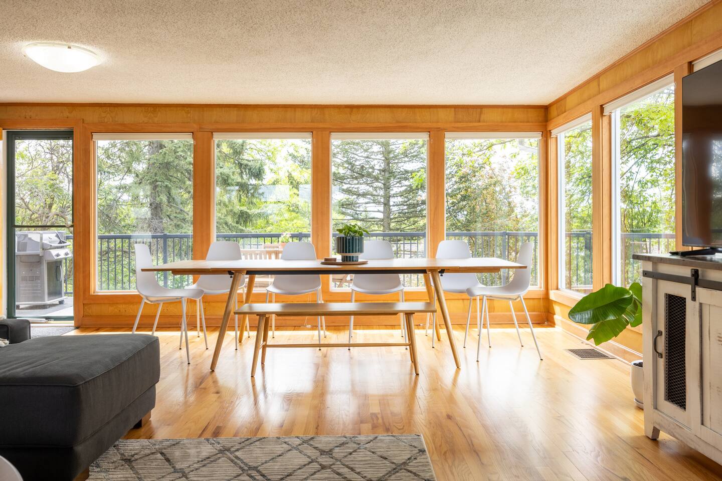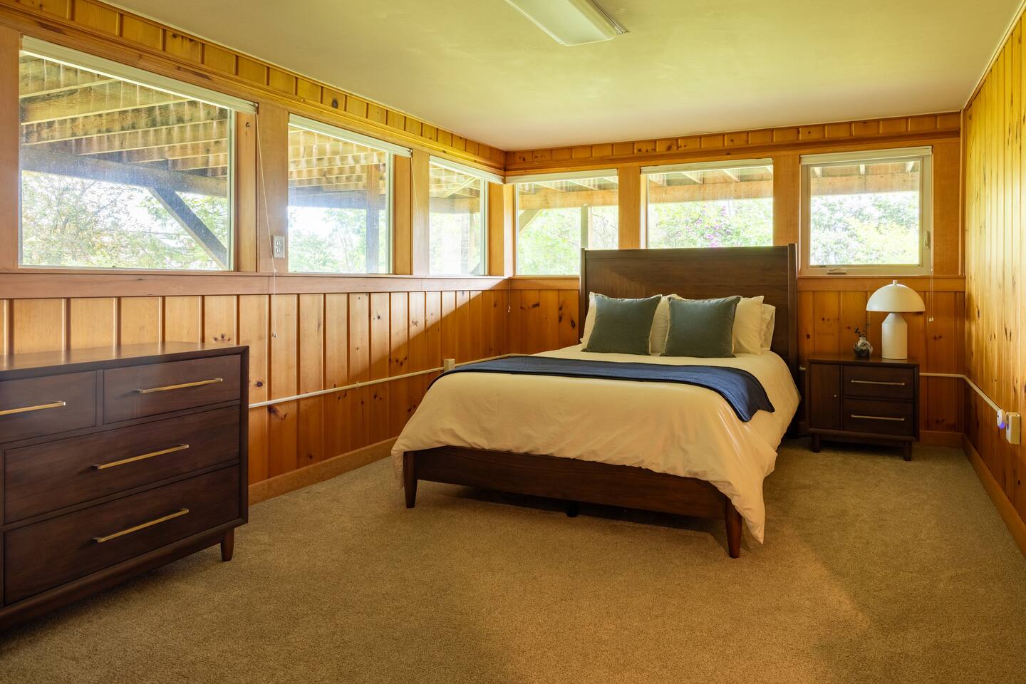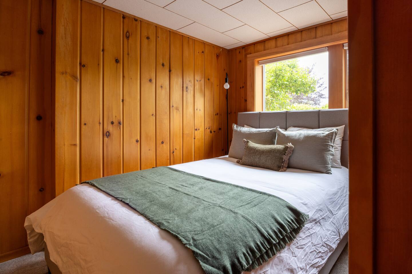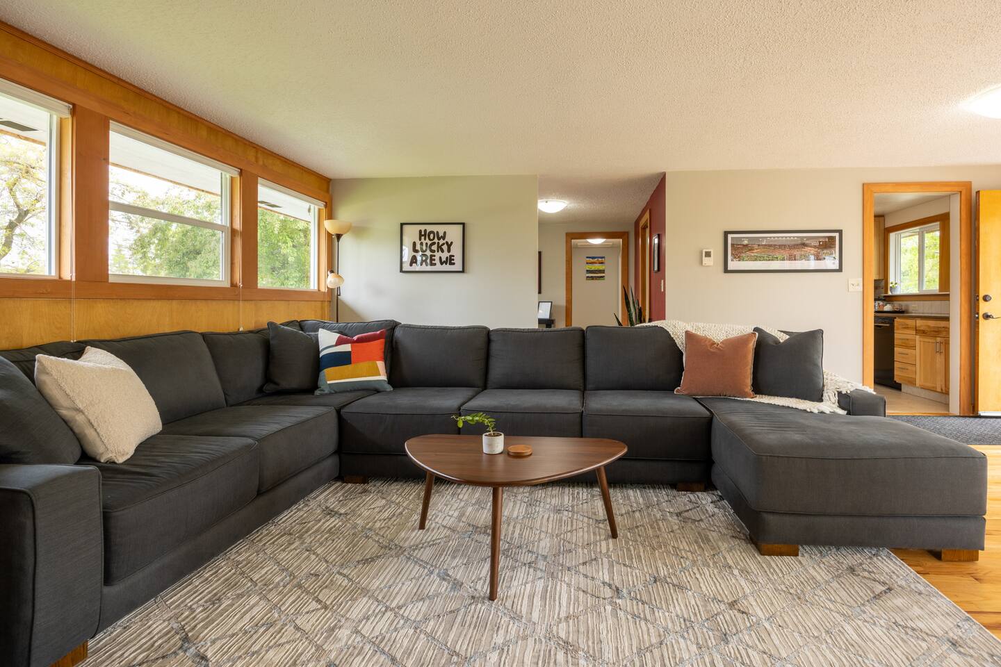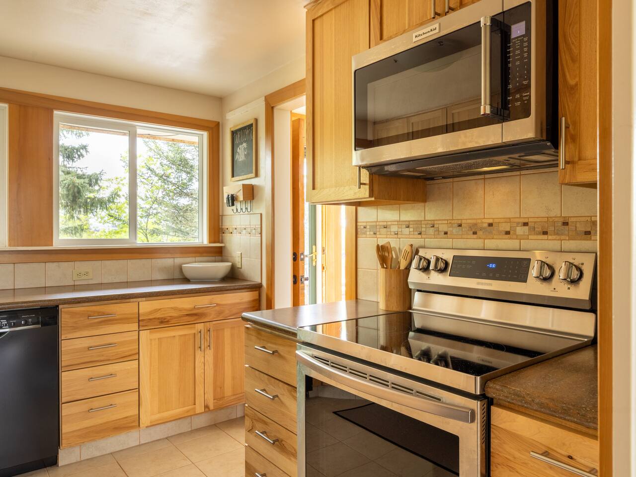 Welcome to The Stadium View House – your home away from home! This spacious and stylish five-bedroom, two-bathroom home is located just steps from Washington State University, offering unbeatable views of campus and the rolling hills of the Palouse. Whether you’re here for a game, graduation, or a quiet getaway, you’ll enjoy comfort, convenience, and character in this updated mid-century retreat. Step inside the upper level and you’re greeted by a bright, open-concept living and dining area with expansive picture windows that frame the stadium and university skyline through the trees. The living room is perfect for gathering, relaxing, or streaming your favorite shows with fast WiFi. Adjacent to the dining space, a large back deck awaits—with a gas grill and plenty of seating—ideal for outdoor meals or evening hangouts. The fully stocked kitchen includes everything you need to cook at home, from cookware and utensils to a Keurig with coffee pods and tea. Upstairs you’ll also find two cozy bedrooms with queen beds, luxe linens, and convenient storage, as well as a full bathroom with a tub-shower combo. Head downstairs to discover three more bedrooms, each with a comfortable queen bed. Two are spacious and airy, while the third is snug yet restful—perfect for a good night’s sleep. All rooms offer closet space or luggage stands for your convenience. The lower level also features a second bathroom, laundry room with washer/dryer, and a fun retro-style drinks fridge. Original mid-century wood paneling adds a nostalgic charm throughout the downstairs level. Perfect for: Couples, families, alumni gatherings, game day weekends, graduation celebrations, and extended stays.